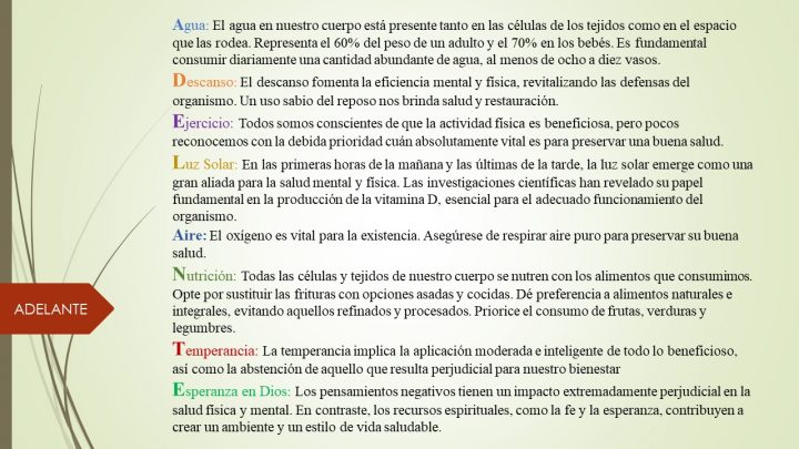 Ahora que está informado, cuenta con los 8 remedios que Dios nos brindó para mantenernos saludables o restaurar la salud. Seguir estas sencillas reglas le permitirá disfrutar de una vida plena y mejorar su calidad de vida. Todo esto se resume en una palabra: ADELANTE.